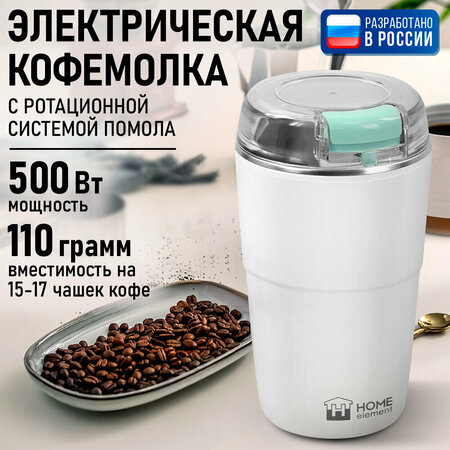 Кофемолка HOME ELEMENT HE-CG1300A: стильный и функциональный помощник на вашей кухне Мощность и производительность Кофемолка HOME ELEMENT HE-CG1300A оснащена мощным двигателем на 500 Вт, что обеспечивает быстрое и качественное измельчение кофейных зерен. Чаша объемом 110 г позволяет приготовить достаточное количество кофе для всей семьи или друзей. Прочный и безопасный материал Кофемолка выполнена из пищевого пластика, что гарантирует безопасность использования и долговечность прибора. Нож из нержавеющей стали обеспечивает высокую режущую способность и долгий срок службы. Защита от перегрева и блокировка включения Кофемолка оснащена системой защиты от перегрева, что предотвращает выход из строя устройства при длительной работе. Блокировка включения при снятой крышке обеспечивает дополнительную безопасность и удобство использования. Стильный дизайн и цвет Кофемолка имеет стильный белый корпус с мятными вставками, который легко впишется в интерьер любой кухни. Выбирая кофемолку HOME ELEMENT HE-CG1300A, вы получаете надежный, функциональный и стильный прибор для приготовления ароматного кофе.