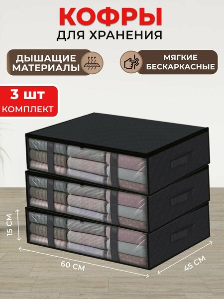 Комплект кофров для хранения вещей, 3 шт. Удобный размер, идеальная система хранения вещей, набор кофров для хранения вещей. Кофр для одежды 60х15х45 см (объем 41 л). Используйте данные кофры как органайзер для белья в шкаф, для хранения постельного белья, летних предметов домашнего обихода, тонкого одеяла или подушки, а также как органайзер для хранения одежды и нижнего белья, в шкаф для хранения, шкафчик для одежды, стеллаж для хранения вещей, как органайзер на кроватку, органайзер на кровать, для хранения одежды кофр, как кофр для хранения одеял и подушек, или других предметов домашнего обихода, а также как органайзер для хранения постельного белья, кофр для хранения стеганого одеяла или хлопчатобумажной одежды, пледов, пуховиков. Храните в нем любые вещи. Эти качественные кофры для хранения одежды под кроватью предлагают идеальное решение для организации и сохранности вашей одежды, белья и других предметов. Кофры для хранения вещей на молнии изготовлены из прочного материала без запаха. Мешки для хранения вещей экологичны и дружественны к окружающей среде. Материал также обеспечивает надежную защиту от пыли, влаги и насекомых, сохраняя ваши вещи в безупречном состоянии. Чехол для хранения одежды имеет ключевое преимущество - влагостойкость и воздухопроницаемость, что обеспечивает оптимальные условия для хранения. Благодаря их большой вместимости Вы сможете сэкономить место в шкафу и эффективно использовать как органайзер для вещей хранение, а также как органайзер на кроватку детскую. Удобные мягкие ручки делают мешок для хранения вещей легким в использовании и переноске. Надежные плавные двойные молнии обеспечивают удобный доступ к содержимому. Органайзер для одежды в шкафу бережно сшит вручную из плотного материала, гарантируя высокое качество. Чехлы для хранения одежды производятся на фабрике с проверкой материала и контролем качества. Их трехслойная конструкция делает их прочными и долговечными. Для хранения вещей кофр, органайзер для хранения вещей имеет красивый дизайн и универсальный цвет, он впишется в любой интерьер и обеспечит для одежды и вещей хранение, а также хранение постельного белья. Дышащий материал предотвращает скопление запахов и плесени. Многофункциональная система хранения позволяет использовать их для различных предметов. Контейнер для белья и вещей легко протирается, не требуя стирки. Органайзеры для хранения одежды отлично подходят для открытого хранения, а также могут быть размещены горизонтально или вертикально. Кофр для постельного белья, кофр под кровать поможет Вам навести порядок в доме и на даче. Также контейнер для одежды и белья организует идеальное хранение вещей в шкафу, на даче и под кроватью.