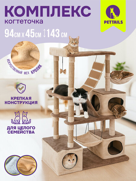 Когтеточка для кошек, PetTails "виктор" разборный, 5-ти уровневый, с качелями и гамаком 143 х 45 х 94см, бежевый