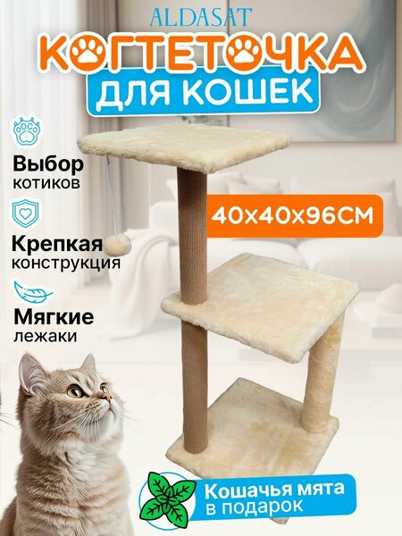 Лежанка для кошек с когтеточкой столбиком. Ваш котёнок влюбится в эту лежанку. Эта кошачья когтеточка без домика, но обеспечит защиту мебели, стен (обоев) от царапин. Котенок с удовольствием будет драть когтями эту ковровую когтеточку, так как картонная не всем нравится. * Общие размеры в собранном виде 40х40х96 см * Когтеточка столбик ковролинновая высокая 50 см и 40 см, идеальна для больших котов. * Когтедралка имеет большую полку для кошек 36х36 см. *Так же игровой комплекс для кошек имеет дразнилку шарик развлечение для котят и кота. *Полочки обтянуты нежным премиальным искусственном мехом. Игровой комплекс имеет следующие размеры в собранном виде: * Общие габариты: 40х40х96 см * Нижняя и средняя полка: 36х36 см * Верхняя полка: 25х25 см * Диаметр столбика: 7 см * Размер нижних столиков: 50 см * Размер верхнего столбика: 40 см * Габариты упаковки: 51х36х13 см Комплектация: *Мягкие полки – 3шт; * Набор фурнитуры – 1уп; * Меховой столбик 50 см – 1шт; * Ковролиновый столбик 40 см – 1шт; * Ковролиновый столбик 50 см – 1шт; * Ароматная кошачья мята – 1уп; * Шар игрушка для котов и игрушки для котят – 1шт
