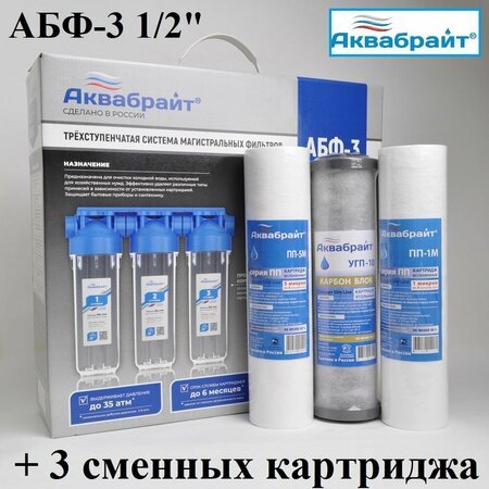 Магистральный фильтр аквабрайт АБФ-3 1/2" предназначен для установки на магистраль холодного водоснабжения в квартире, загородном доме, кафе, ресторане и т. д. В корпуса устанавливаются картриджи типоразмером 10 Slim Line, в зависимости от характера загрязнения воды. Создан на базе АБФ-10-12, обладает выдающимися показателями прочности и надёжности, а прозрачные корпуса, позволяют визуально оценить степень загрязнения установленных в них картриджей. Рекомендуемые комплекты под различные виды загрязнений: Комплект картриджей Аквабрайт К-1 стандарт (Код товара: 378758530)-для нормальной воды Комплект картриджей Аквабрайт К-2 умягчение (Код товара: 379531678)- для жёсткой воды Комплект картриджей Аквабрайт К-3 антижелезо (Код товара: 378799755) - для железистой воды Преимущества: уплотнительное кольцо исключает вероятность протечки и обеспечивает более надежное соединение колбы и крышки фильтра в резьбовых соединениях установлены латунные вставки которые обеспечивают надежное соединение кронштейн к крышке фильтра прикручивается четырьмя винтами использование современных материалов и улучшенная технология изготовления пластиковых деталей корпуса, позволила увеличить запас прочности от разрешения фильтров (более 50 атмосфер) Конкурентная цена Характеристики: 3 Прозрачных корпуса Термическая спайка стыка корпуса Рабочая температура: +2.+35°С Давление разрушения: более 30 атм Рабочее давление: 2.6 атм Номинальное давление: 3 атм Производительность: до 10 л/мин Диаметр подключения: 1/2" Латунная резьбовая вставка ВхШхГ: 315х306х102 мм Вес: 1650 г Типоразмер картриджа: 10 Slim Line (h - 254 мм)