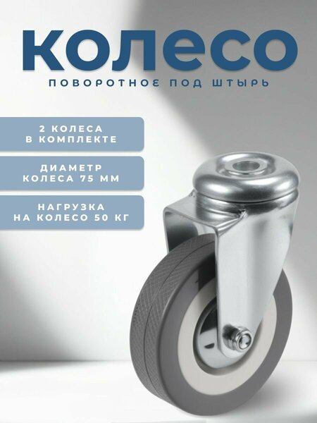 Колесо поворотное с диаметром 75мм, изготовленное из прочной серой резины, используется для перемещения мебели или оборудования. Комплект 2 шт. Плавный и тихий ход позволяет использовать его в различных помещениях. Диаметр - 75 мм. Нагрузка на одно колесо -50 кг. Колёса предназначены для мебели, торгового и выставочного оборудования. Позволяют передвигаться по любому покрытию: ламиниту, линолеуму, паркету и даже кафельной или гранитной плитке. Не оставляют следов, не шумят. Ваш пол не поцарапается и не испачкается черными полосами.
