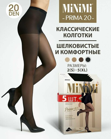 Колготки женские набор 5 штук. Колготки женские MINIMI PRIMA 20 den - тонкие эластичные колготки. Благодаря усиленным шортикам, удобному поясу и комфортным швам колготки превосходно сидят и отлично облегают. Укрепленный мысок увеличивает износостойкость и прочность. Легкие, мягкие и шелковистые - колготки PRIMA 20 приятно ощущаются на теле и подчёркивают изящество и красоту ног. Классические элегантные женские колготки MINIMI PRIMA 20 den - универсальная модель на каждый день, они отлично сочетаются с абсолютно разными нарядами. Классическая палитра оттенков позволяет подобратьидеальный цвет для любого образа. Цвета: капучино - Cappuccino; карамельный - Caramello; бежевый - Daino; черный - Nero. В ассортименте MiNiMi представлен широкий выбор товаров: Нижнее белье. Купальники. Носки и подследники. Чулки классические капроновые и в сетку, самодержащиеся и на подвязках (с поясом), пояс для чулок, кружевные эротические и повседневные. Колготки на любой случай: на каждый день 15, 20, 30 или 40 den; летние без пальцев и ультратонкие 8 den; плотные и теплые 70, 100, 200 и более den; зимние с начесом, мехом, флисом; утягивающие и корректирующие фигуру; фантазийные, тюль, в сеточку, цветные, с рисунком, люрексом, тату, имитацией чулок, со швом сзади, повседневные, новогодние, праздничные, для свадьбы, матовые, капроновые, большого размера, для беременных и многое другое. С MiNiMi каждый день ты можешь быть разной!