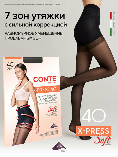 Колготки с уникальной конструкцией торса «7 зон» X-Press 40 равномерно уменьшают проблемные зоны бедер, талии и живота минимум на 1 размер. Специальные эластичные поддерживающие вставки создают эффект push-up для ягодиц, делая их более подтянутыми и округлыми. • специальная конструкция усиленного торса • 7 зон утяжки с сильной коррекцией •равномерное уменьшение проблемных зон • эффект push-up • плоский шов • укрепленный мысок • хлопковая ластовица • 5-ый размер с большой вставкой • равномерное уменьшение проблемных зон минимум на 1 размер