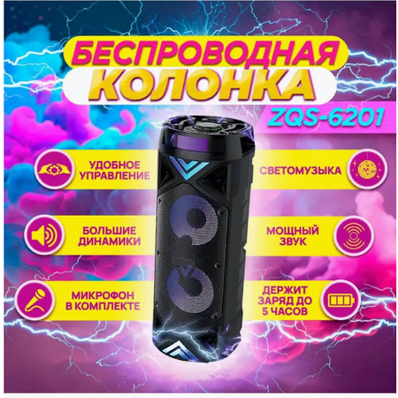 Колонка портативная BTS ZQS-6201 с микрофоном, радио и цветной подсветкой - это полноценная качественная аудиосистема с громким звуком и светомузыкой. Колонка ZQS-6201 отлично подойдет для любителей походов, отдыха на природе или даче, ее удобно брать с собой, она имеет небольшой вес и удобно размещается в багажнике или на заднем сиденье автомобиля; Портативная колонка BTS ZQS-6201 подключается к любым устройствам по средствам Bluetooth, а также имеет USB вход для флэш-дисков; Колонка легко интуитивно управляется с помощью панели, она рассчитана на 4,5 часа автономной работы без подзарядки и позволит наслаждаться любимой музыкой. Блютуз колонка оснащена разъемом для микрофона для любителей караоке, это незаменимый спутник на выездных мероприятиях и доставит множество приятных моментов Вам и Вашим близким. Отличный подарок для самых любимых!