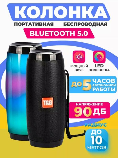 Музыкальная bluetooth (блютуз)-колонка t&g является отличной портативной системой для улицы, дома, в машину. Подходит к любой компьютерной, тв, фото, аудио, видео технике. Колонка подходит для детских игр, планшета и развлечений. Акустический динамик без флешки оснащен подсветкой, которая переключается в 5 световых режимах, регулятором громкости, встроеным микрофоном, с помощью которого можно отвечать на звонки мобильного телефона и управлять голосовым помощником, а также имеет радиоприемник (FM радио) и разъемы под силиконовой заглушкой под аукс, юсб (для пк и ноутбука), MicroSD и для флеш карты (флешка). Разъёмы предназначены для: micro - USB разъём для зарядки (в комплектацию входит USB - кабель), разъём AUX через который вы можете подключить колонку к смартфону, mp3 - плееру, аудиоплеер, музыкальному центру и др, разъём USB для флэшки, разъём под микро - SD карту. Не большая, а маленькая звуковая стерео с басами система в отличие от напольной ипроводной аудиотехники легко помещается в рюкзак или сумку, не надо носить с собой зарядку, провода, потому что блютус акустика прекрасно работает от аккумулятора до 5 часов, а также позволяет воспользоваться флешкой. Мини boombox подходит для компьютера, телевизора также, как tronsmart t7 (тронсмарт), колонка макс маруся (marussia), jbl charge 5, xiaomi, яндекс, melarto, доу макс, колонка лампа медуза/капсула/машинка/часы, defender (дефендер), умная колонка алиса с часами. Несмотря на размер компактная переносная беспроводная аудиосистема очень мощная и обеспечивает звук сабвуфер в высоком качестве, а присутствие баса делает звучание громким, что подойдет для активных домашних вечеринок и караоке вечеров. Купите светящийся аксессуар для музыки с водонепроницаемым корпусом в подарок для девочки и мальчика, подростка и юноши, а также мужчины и женщины на новый год, 8 марта и 23 февраля, также порадует на день рождение и окончание учебного года.