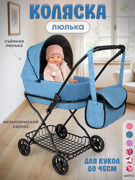 Коляска Люлька для кукол до 45см, металлическая с сумкой и корзиной