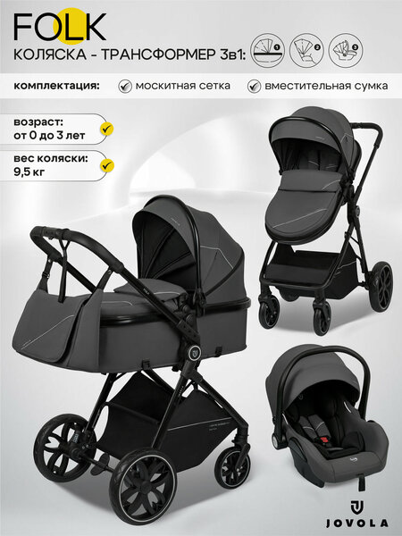 Коляска трансформер для новорожденных 3 в 1 Jovola Folk универсальная, всесезонная, серый