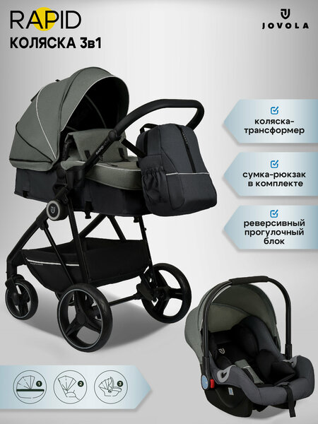 Практичная, функциональная, всесезонная коляска трансформер Jovola Rapid предназначена для детей с рождения до 3-х лет. Трансформеры не занимают много места и намного экономичнее модульных моделей. Один ее блок заменяет собой два блока универсальной коляски, так же в комплекте люлька-переноска. Для новорожденных используется люлька. Она просторна и удобна. Люлька-переноска устанавливается и надежно фиксируется на раме коляски с помощью специальных креплений. Оснащено удобной ручкой для переноски, 3-х точечными ремнями безопасности, капюшоном, ортопедическим вкладышем. Крепления в комплекте. С 6 месяцев модель трансформируется в прогулочную коляску с реверсивным блоком. Внешний чехол из водоотталкивающей, не продуваемой ткани позволяет использовать ее круглый год как зимнюю и летнюю. Капюшон опускается до самого бампера. Дополняет его накидка на ножки из 2х слойного материала. Вместе они надежно защищают малыша от ветра и осадков. Сверху на капюшоне имеется окошко наблюдения, а на задней части- карман для мелочей. Съемный бампер, регулируемые по высоте ручка и подножка изготовлены из качественной эко кожи, что делает их практичными в уходе. Свободная регулировка наклона спинки и подножки обеспечивают ребенку комфортное положение во время прогулок. Вместе они образуют спальное место размером 77см*31 см. Для надежной фиксации маленького пассажира предусмотрены 5-точечные ремни безопасности. Колеса из износостойкого EVA с амортизаторами обеспечивают мягкость и легкость хода. Они не боятся проколов и не нуждаются в подкачивании. Передние, с вращением на 360°, можно заблокировать для прямолинейного хода. Стояночный тормоз центральный, ножной. Для безопасности в темное время суток на капюшоне, накидке для ног и корзине для багажа предусмотрены светоотражатели. В комплекте антимоскитная сетка и подстаканник. Рама складывается книжкой