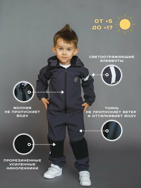 Перед Вами лучший демисезонный мембранный комбинезон Ползком из ткани softshell на весну и осень. Легкий и дышащий, но при этом прекрасно сохраняющий тепло. Темп. режим от +5 до +17 (в зависимости от нижнего слоя). 4 причины выбрать нас: 1. Высочайшие показатели мембраны 10к/8к (у большинства производителей 3/3). Наша ткань не даст ребёнку вспотеть. 2. Прочные усиленные наколенники из неопрена. Наше Ноу-Хау. Смягчает удары при падении, не пропускает воду, и совершенно не страдает от механических трений. Ползайте, сидите на коленях в мокром песке, падайте - с ними ничего не будет. 3. Идеальная по посадке модель. За 4 года мы продали более 14 тыс. экземпляров. 4. Функциональные элементы: лямки на плечах для снятия комбеза в тепле, без полного раздевания, светоотражающие элементы, глубокий капюшон, вшивные прорезиненные штрипки, молния с аква и ветро защитой. В некоторых случаях возможно незначительное различие оттенков. СМ. фото. Комбинезон детский весенний и осенний на мальчика и на девочку