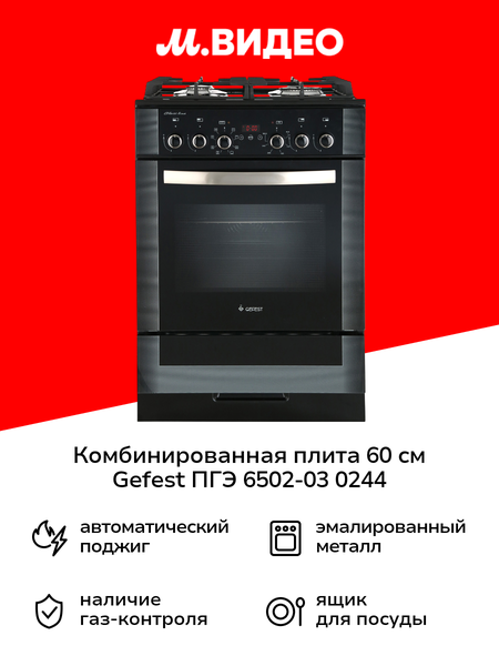 Комбинированная плита Gefest ПГЭ 6502-03 снабжена четырьмя конфорками – в том числе одной двухрядной горелкой, подходящей для ускоренного нагрева продуктов и приготовления экзотических блюд в сковородах вок. Они установлены на рабочем столе из закалённого стекла. Гладкая поверхность красива, прочна и практична – её можно быстро отмыть от жира и копоти. для любых задач Плита снабжена большой электрической духовкой с грилем и конвектором. Она позволяет готовить множество блюд – от маленьких пирожных до больших кусков мяса и целой курицы. К ней прилагаются вертел и шашлычница. Электромеханический привод вращения обеспечивает равномерную прожарку, а встроенный термостат поддерживает постоянную температуру, защищая продукты от пригорания. исключительное удобство Задавайте время приготовления лёгким прикосновением к сенсорной панели. Вы можете устанавливать таймер со звуковым сигналом или автоматическим отключением духовки. удобство И безопасность Чтобы разжечь огонь, вам нужно только повернуть соответствующий регулятор и нажать на него. Если пламя случайно погаснет, электроника остановит подачу газа, предотвратив утечку. продуманная конструкция Вместительный ящик в нижней части устройства позволяет держать под рукой противни, решётки, сковороды и другую кухонную утварь. Съёмные направляющие помогают быстро очищать внутренние стенки духовки.
