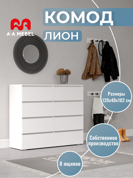 Комод " Лион" с 8 ящиками от A-A MEBEL - идеальное решение для вашей квартиры, дома, дачи или офиса, объединяющее стиль, экологичность и высокое качество. Благодаря своему продуманному дизайну и белому цвету, этот комод идеально впишется в любой интерьер, создавая комфорт и уют в вашем доме. Он также поможет придать интерьеру современный и стильный вид. Функциональный и компактный комод " Лион" идеально подходит для гостиной, спальни, детской и даже прихожей. Вместительные выдвижные ящики на шариковых направляющих позволяют эффективно использовать пространство и обеспечивают удобное хранение ваших вещей. Изготовлен из экологически чистых материалов высокого качества, что гарантирует долгий срок службы до 20 лет и сохранность вещей в первозданном виде. Он станет отличным решением для хранения вещей в спальне, для детских игрушек и одежды в детской комнате, с легкостью разместится в прихожей или будет служить в качестве тумбы под ТВ в гостиной. Отсутствие выступающих ручек подчеркивает современный стиль комода и делает его безопаснее. Простота сборки и понятная инструкция позволят самостоятельно и быстро собрать комод без сложностей, а наша служба поддержки будет сопровождать вас на всех этапах.