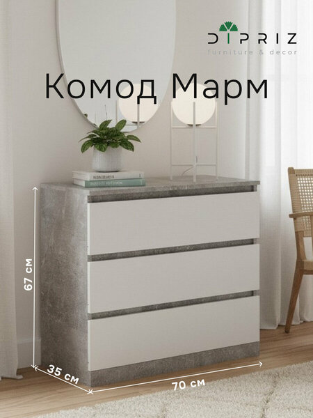 Комод Марм отлично подойдет для игрушек и детских вещей, для белья и одежды, для косметики, для книг и инструментов. Комод для вещей 3 ящика создаст порядок в любой комнате, будь то прихожая, спальня, гостиная, ванная или детская комната. Данная модель комода может быть использована как комод под телевизор, особенно если совместить два комода вместе. Расположив мебель в прихожей, вы сможете организовать хранение обуви, аксессуаров и других необходимых предметов, сохраняя порядок и чистоту в вашем входном пространстве. Деревянный комод можно использовать с письменным столом для создания удобного офиса. Если вы обустраиваете детскую комнату, наш детский комод станет прекрасным дополнением к интерьеру, чтобы получился замечательный комод для игрушек. Поставьте его в спальню, и получится хороший комод для вещей с ящиками. Ящики комода бетон Марм можно использовать для хранения вещей одного типа или тематически разделить их по назначению. Например, верхние ящики использовать под носки, перчатки и шарфы, средние - под футболки и майки, нижние - под пижамы и домашнюю одежду. Также улучшили направляющие - теперь комод в прихожую комплектуется деревянными направляющими, которые будут плавно выдвигаться и тихо закрываться, более надежны и долговечны. Комод с ящиками изготовлен белорусским производителем "Диприз" из высококачественного ЛДСП (содержание формальдегида в плите соответствует классу Е1 - не превышает 10 мг на 100 г плиты), что позволяет безопасно использовать комод даже в детской. Для задней стенки комода и дна ящиков использовалось ДВП. Деревянный комод с ящиками выполнен на высокоточном оборудовании, все кромки изделия обработаны промышленным методом на современных станках, что обеспечивает ее плотное прилегание и прочность древесного слоя при контакте с влагой, устойчивость к влажности и деформации. Максимальная нагрузка – 10 кг. Размеры комода: • Ширина – 70 см • Высота – 67 см • Глубина – 35 см Размеры упаковки: • Длинна – 79 см • Ширина – 38 см • Высота – 17 см • Вес – 24 кг. Сборка комода для игрушек в домашних условиях не вызовет трудностей за счет понятной инструкции по сборке и комплекта необходимой фурнитуры. Наша компания обеспечивает надежную упаковку товара с дополнительной защитой для предотвращения повреждений при транспортировке. Комплектация • Комод - 1 шт • Фурнитура - 1 комплект • Инструкция по сборке Гарантийный срок - 24 месяца. Комод Марм – это современное сочетание стиля и функциональности. Минималистичный дизайн и просторные ящики делают его идеальным выбором для хранения вещей и создания стильного интерьера. Комод для одежды отлично впишется в комнаты современного и скандинавского стиля, бохо, лофт, минимализм. Выбирая стильный и экологичный комод Марм, вы делаете ответственный выбор в пользу природы и создаете функциональное и эстетичное пространство для хранения вещей в вашем доме. Подчеркните уникальность и создайте свое уютное домашнее пространство с нашей мебелью. Мы заботимся о Вашем удобстве! Комод изготовлен на белорусском предприятии «Диприз». Фабрика с 1992 года производит мебель из массива дерева, МДФ, металла и других материалов. Производство находится в городе Барановичи и насчитывает более 700 работников. Каждое изделие проходит 3 этапа контроля качества.