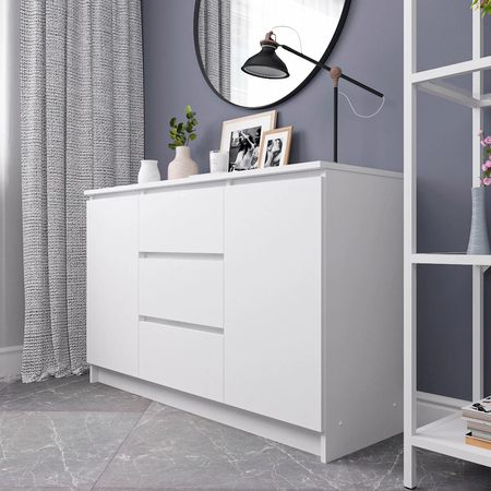 Практичный, компактный и функциональный комод Мори МК 1200.3 имеет удобные выдвижные ящики и полки за створками. Комод для белья разделен на три секции перегородками: В средней секции расположены три выдвижных ящика. В крайних секциях съемные полки, находящиеся за створками. На фасадах ящиков отсутствуют ручки, функцию ручек выполняет сам фасад. Глубина ящиков - 360 мм. Современный и стильный дизайн, который поможет правильно организовать любое пространство в Вашей квартире. Белый комод - весьма необходимый предмет мебели в любой спальне, гостиной. Это очень функциональная вещь и при этом достаточно компактная. Основное его предназначение - хранение одежды, постельного белья и других небольших вещей.