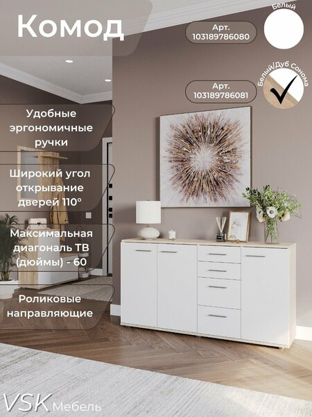 Большой, широкий, очень вместительный комод- универсальное и практичное решение для любого интерьера. сочетание полок с ящиками разного размера позволит с максимальным удобством разместить вещи. можно использовать и как тумбу под тв. Фасад: ЛДСП 16мм Цвет: Белый матовый Корпус: ЛДСП 16мм Цвет: Дуб Сонома Распашные двери открываются «на себя» и оборудованы накладными петлями (накладная - 4шт, полунакладная - 2шт) с широким углом открывания - 110 градусов. Ниши за распашными дверцами Размеры (мм): № 1 - 664 x 305 Высота - 209 № 2 - 664 x 305 Высота - 212 № 3 - 664 x 305 Высота - 230 № 4 - 320 x 305 Высота - 209 № 5 - 320 х 305 Высота - 212 № 6 - 320 x 305 Высота - 230 Надежные полки из качественного ЛДСП - 4шт Размер (мм); 663 x 300 x 16 - 2шт 319 x 300 х 16 - 1шт Максимальная нагрузка: на полку - З кг, на ящик З кг, на крышку комода - 20кг Максимальная диагональ ТВ (дюймы) - 60 Роликовые направляющие частичного выдвижения обеспечивают комфорт и удобство открывания. Удобные эргономичные ручки серого цвета подчеркивают красоту белоснежных фасадов и добавляют «изюминку» в интерьер. Пластиковые опоры-квадрат черного цвета размером 55 х 55 х 20 мм выдерживают нагрузку до 450кг Просвет от пола до основания - 20мм