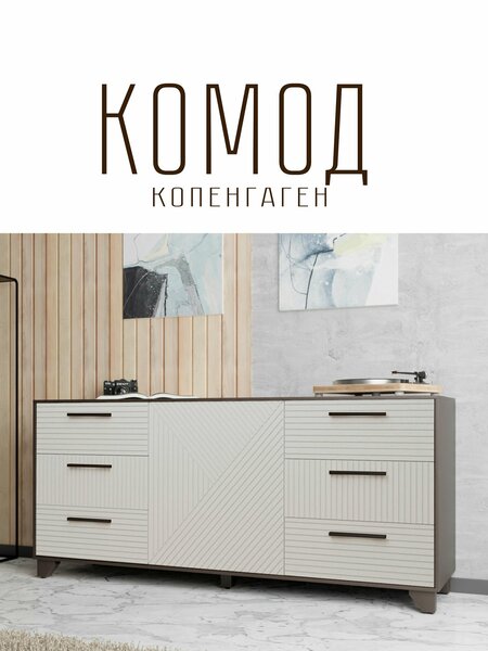 Комод Копенгаген станет практичным решением и для спальни, и для гостиной. Он прекрасно подойдет для хранения предметов одежды, текстиля, личных вещей. Поверхность комода можно использовать для размещения предметов декора. Модель оснащена шестью выдвижными ящиками на шариковых направляющих полного выдвижения. Между ящиками за створкой располагается ниша с двумя полками. Створка крепится на петли с доводчиком для плавности хода. Для открывания ящиков установлены ручки из массива дуба, на створке конструкцией предусмотрен механизм «push-to-open». Комод устанавливается на ножки из массива дерева, регулируемые по высоте. Подобрать необходимую модель для интерьера позволит комбинирование расцветок фасада и корпуса. Размеры комода: ширина – 150 см, глубина – 40 см, высота – 70 см. Высота фасада - 60 см, высота ножки - 10 см. с возможностью регулировки высоты. Материал изделия: корпус – ЛДСП 16 мм (кромка 0,4 мм в цвет корпуса), фасады – МДФ 16 мм (фрезеровка, покрыты премиальной ПВХ-пленкой Praim). Задняя стенка – лхдф 3,2 мм. Товар поставляется в разобранном виде. Мы рекомендуем собирать мебель с привлечением профессиональных сборщиков и согласно вложенной инструкции.