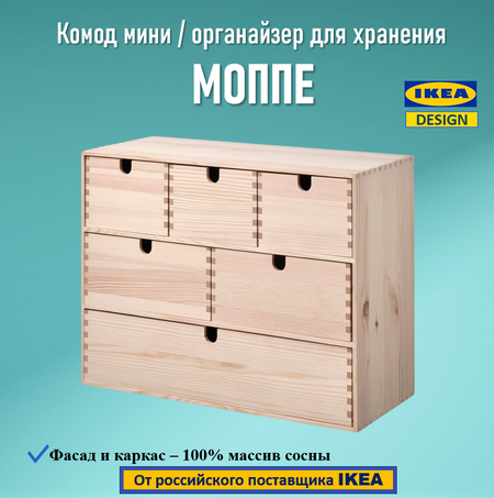 Комод мини МОППЕ/MOPPE с 6 ящиками– это настольный органайзер, который объединяя в себе компактные размеры и максимальную вместительность, позволяет хранить различные предметы и аксессуары в удобном и стильном исполнении. Мини-комод представляет собой набор выдвижных ящиков в количестве 6-ти штук, разного размера: 40х17,2х9,5см-1шт, 20х17,2х9,5см-2шт, 13,3х17,2х9,5см-3шт, расположенных в горизонтальном и вертикальном направлении. Каждый ящик оснащен удобными выпилами под палец, облегчающими их открытие и закрытие. Мини-комод изготовлен из массива сосны. Он легко устанавливается на полки, столы, подобно шкатулке или ларцу, выполняя функцию органайзера, избавляя владельцев от бесконечных поисков небольших, но нужных вещиц. Несомненным плюсом мини-комода является идеальная сортировка мелочей, которые могли бы затеряться. Мини-комод функционально впишется в интерьер любой комнаты: прихожей – пригодится для ключей, перчаток, ремней, различных чеков, квитанций; гостиной – для хранения украшений, аксессуаров; кухни – поможет рассортировать приправы, мелкие банки с разным содержимым; рабочего кабинета – упорядочит канцелярские аксессуары, предметы для рукоделия, зарядные устройства, USB-накопители; детской комнаты – вместит канцелярские предметы, небольшие детские игрушки; спальни – позволит хранить нижнее белье и другие приятные мелочи, косметику. Также выдвижные ящики с удобным доступом часто применяют для хранения лекарств. Мини-комод ничем не покрыт, что позволяет его покрасить в любой цвет, а также он идеально подойдет для декупажа, росписи и дальнейшего декорирования.