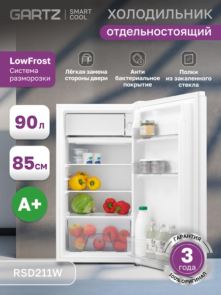 Холодильник мини RSD211W — это удобное и компактное решение для дома, дачи, офиса, отеля или апартаментов. Стильный белый корпус и современный дизайн позволяют вписаться в любой интерьер. Две камеры: холодильная и зона свежести объемом 11 л для хранения легко портящихся продуктов при температуре около 0 °C. LowFrost: капельная система охлаждения снижает образование инея и упрощает разморозку. Экономичный и тихий: класс энергоэффективности A+, уровень шума всего 38 дБ. Удобная организация пространства: 4 стеклянные полки, 3 полки на дверце, прочные и легко моющиеся материалы. Функциональность: перенавешиваемые двери, антибактериальная защита, компактные габариты — легко установить даже в ограниченном пространстве. Общий объем: 90 л (полезный — 86 л) Габариты (Ш×Г×В): 44,4×48,5×84,3 см Управление: механическое Потребление энергии: 106 кВт·ч/год Хладагент: R600a Производство: Китай