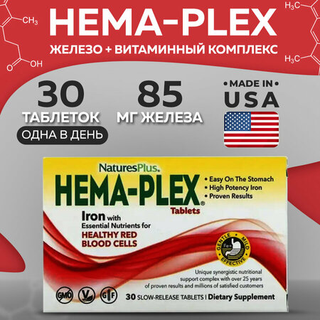 Комплекс витаминов и минералов, Hema-Plex - это таблетки, содержащие смесь основных витаминов и минералов, передовая формула, разработана с целью обеспечить организм большим количеством витаминов и минералов, необходимых для поддержания нужного количества железа. Хелат железа легче переносится желудком, чем обычные железосодержащие добавки. Недостаточность железа ведет к снижению работоспособности, утомляемости, слабости, головокружениям, выпадению волос. Также в формулу комплекса Хема Плекс входят такие важные для здоровья крови элементы, как витамины С и Е, витамины группы В, а также медь и фолиевая кислота. NaturesPlus Hema-Plex Iron сочетает в себе железо с мощными кофакторами, улучшающими здоровье крови, такими как витамин C и синергетические биофлавоноиды, для поддержания здоровых эритроцитов. Железо в этой добавке мягкое и не связывающее, свободный от общих аллергенов, эта формула не содержит общих аллергенов молока, яиц, рыбы, ракообразных моллюсков, орехов, пшеницы, арахиса и соевых бобов. Железо HEMA-PLEX обеспечивает быструю и эффективную пищевую добавку за счет включения биофлавоноидного комплекса для улучшения использования минералов, а также широкого спектра незаменимых кофакторов для максимальной эффективности. Прием железа может негативно сказаться на пищеварительной системе. Наша мягкая формула делает прием добавок железа легким и мягким. Применение: Принимать по 1 капсуле в день. Противопоказания: Индивидуальная непереносимость ингредиентов, при беременности проконсультироваться с врачом, хранить в защищенном от детей месте. Хранение: Хранить в защищенном от детей месте. Комплекс витаминов и минералов Hema-Plex представляет собой таблетки, содержащие смесь необходимых витаминов и минералов. Этот продукт обеспечивает организм важными веществами, которые способствуют поддержанию нормального уровня железа. Хелатное железо легче усваивается желудком по сравнению с обычными добавками, содержащими железо. Дефицит железа может привести к снижению работоспособности, утомляемости, слабости, головокружению и выпадению волос. Формула Hema-Plex включает витамины С и Е, витамины группы B, медь и фолиевую кислоту. NaturesPlus Hema-Plex Iron сочетает железо с мощными кофакторами, такими как витамин C и синергетические биофлавоноиды, которые способствуют поддержанию здоровья крови и производству здоровых эритроцитов. Железо в этой добавке является мягким и не связывающим, свободным от распространенных аллергенов. Формула не содержит аллергенов, таких как молоко, яйца, рыба, ракообразные, орехи, пшеница, арахис и соя. Hema-Plex обеспечивает быструю и эффективную поддержку благодаря добавлению биофлавоноидов, улучшающих усвоение минералов, а также широкому спектру незаменимых кофакторов для достижения максимальной эффективности. Прием железа может негативно влиять на пищеварение, однако наша мягкая формула делает его использование более комфортным. Применение: Рекомендуется принимать по 1 капсуле в день. Противопоказания: Индивидуальная непереносимость компонентов, консультация с врачом при беременности, хранить в недоступном для детей месте. Хранение: Хранить в защищенном от детей месте. Масса таблеток: 1323 мг.