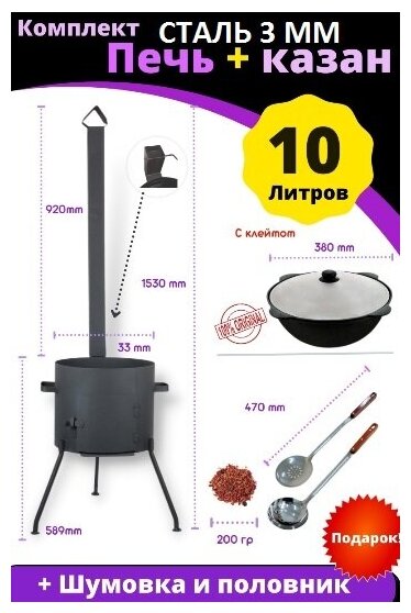 Комплект Печь из стали 3мм с дверцей и трубой разборная под казан 10л, + казан 10л. плоское дно с крышкой. Преимущества нашей печи: -печь изготовлена из стали толщиной 3 мм; -разборная труба для удобства транспортировки; -переносная печь позволит вам большой дружной компанией или своей семьёй выбраться за город на природу; -три съёмные ножки в комплекте обеспечат устойчивость на любых поверхностях; -съемные ножки позволяют компактно положить печь в багажник любого автомобиля; -закрывает очаг дверца для печки, она позволит теплу дольше сохраняться внутри; -печь для казана с трубой отведёт дым в сторону от глаз; -термостойкая краска продлит срок службы, защищая поверхность от высоких температур; -в трубе дымохода вмонтирован шибер для управления пламенем; -может работать на дровах и углях. Предлагаем вашему вниманию очаг для казана 6, 8, 10, 12, 16, 22 литров. Казан узбекский чугунный 10 литров из г. Наманган с плоским дном и толстыми стенками, литье из 100% чугуна. Преимущества: -наши казаны отливаются и шлифуются вручную, благодаря этому внутри они очень гладкие; -за счёт толстых стенок происходит равномерный нагрев и еда в казане не пригорает; -в комплекте идет алюминиевая легкая крышка, которая поддерживает температуру блюда, плотно прилегает и облегчает вес казана; -наш казан подходит для всех типов плит; -антипригарное покрытие отличается особой износостойкостью и рассчитано на интенсивное использование в течение длительного срока. Узбекский казан подойдет для использования на природе, дома, на даче, на пикнике. Казан превосходная альтернатива обычной посуде, такой, как: кастрюля, сковорода, садж, барбекю, чугунок, мангал, гриль, таганок, скороварка, казанок, духовка и др. Чугунная посуда - отличный подарок на любой праздник, на 23 февраля, день рождения, юбилей, годовщину, новый год, новоселье и просто так, без повода. Теги: печь для казана , очаги, чаши и печи для казана , печь под казан , подставка под казан , подставка для казана , очаг для казана , печь для казана , печка для казана , печи для казана , казан с печкой , мангал с казаном , печь с казаном , казан и печь , печь для казана 10 литров , буржуйка печь , печь буржуйка , печь туристическая , печь под казан , печь буржуйка с дымоходом , печь для казана с дымоходом , печь буржуйка , печь для казана , печь чугунная , печь буржуйка чугунная , печь походная , походная печь , печь на дровах , печь с казаном , печь для казана с трубой , казан и печь , печь туристическая , печь мангал , печь для казана 10л , печь казан , печь походная туристическая , печь под казан , печка буржуйка , печка походная , печка под казан , печка для углей , печка буржуйка с дымоходом , печка туристическая