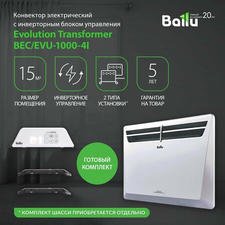 Представляем вам уникальную новинку – Конвектор электрический, блок управления с технологией digital INVERTER - BEC/EVU-1000-4I. отопительные модули EVOLUTION TRANSFORMER SYSTEM оснащены уникальным, запатентованным нагревательным элементом нового поколения, изготовленным ПО технологии HEDGEHOG. Благодаря специально разработанной ребристой поверхности нагревательного элемента, площадь теплоотдачи увеличена на 20&percnt, что дает более высокую производительность и более быстрый обогрев, по сравнению с типовыми нагревательными элементами аналогичной мощности. Трапециевидная форма корпуса и выносная конструкция крепления блоков управления, позволяет равномерно распределять нагретый воздух внутри конвекционной камеры, прогревая помещение на 30% быстрее. Специальная аэродинамическая форма жалюзи разработана с учетом физики конвективных процессов и увеличивает скорость конвективного потока, снижая температуру нагрева внешнего корпуса отопительного модуля. Безопасность подтверждена сертификатом МЧС. Кронштейны для настенного крепления в комплекте, шасси дополнительная опция. блок управления TRANSFORMER DIGITAL INVERTER BALLU BCT/EVU-4I Технология digital INVERTER позволяет экономить электроэнергию до 70%*. Инверторный блок управления плавно изменяет мощность нагревательного элемента и очень точно поддерживает заданную температуру. Функционал блока управления:
