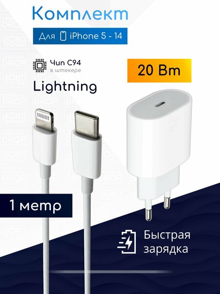 Original Drop представляет мощное зарядное устройство с кабелем для iPhone 5 - 14 поколений, имеющих разъем Lightning. Готовый комплект: • адаптер мощностью 20 Вт и разъемом Type-C; • кабель Type C / Lightning со стандартной длиной 1 м и гладкой оплеткой. Совместим только с устройствами Apple, имеющими разъем Лайтнинг: • iPhone 14 (включая Plus, Pro, Pro Max), 13 (включая мини, Про, Про Макс), 12 (включая mini, Pro, Pro Max); 11 (включая Pro, Pro Max), X, XR, XS, XS Max, SE (2 и 3), 8, 7, 6 и 6s (включая Плюс), 5, 5c, 5s; • iPad 4, 5, 6, 7, 8, 9, mini (1, 2, 3, 4, 5), Air (1, 2, 3), Pro 12,9" (1, 2) • iPod Touch (5, 6, 7), Nano 7; • AirPods 1, 2, 3, Max, Pro (1 поколение); • Magic Trackpad; • Apple Pencil (1 поколение). Быстрая зарядка Блок поддерживает протокол Power Delivery - PD 20W. Время зарядки Айфона от 0 до 100% составляет всего 60 мин. Это в разы быстрее, чем с блоком на 5 Вт. Внимание! Функция доступна только на iPhone 8-14 и следующих iPad: 7-9, Pro 12,9" 1-2, Air 1-3, Mini 5. Более младшие модели будут заряжаться со стандартной скоростью. Чип C94 в штекере Lightning. Обеспечивает значительно более быструю зарядку в сравнении с обычными кабелями Лайтинг, а также защиту от перегрева и перегрузки. Безопасность. Блок имеет встроенную защиту от перезаряда, перегрева, короткого замыкания, скачков напряжения и перегрузки по току. Передача данных. При необходимости вы можете использовать провод из комплекта для передачи данных и синхронизации своего устройства с компьютером. ❤ Набор упакован в презентабельную упаковку, как аксессуары Эпл, - его можно купить в подарок. Зарядный комплект Original Drop - идеальный выбор тех, кто ищет надежный зарядник с функцией быстрой зарядки и качественным кабелем Lighting по разумной цене.