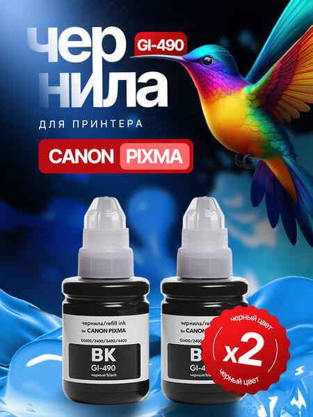 В комплекте 2 флакона чёрных чернил на водной основе (водорастворимых) GI-490BK (black) объёмом по 135 мл.