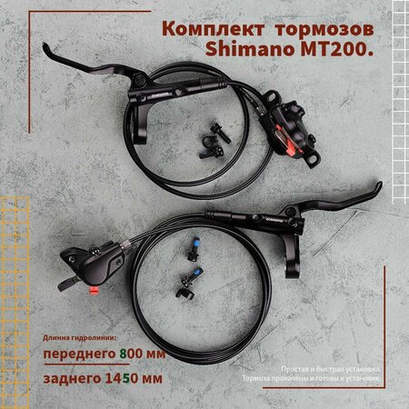 Комплект дисковых гидравлических тормозов Shimano MT200. Мощность данных тормозов адаптирована для райдеров начального уровня. Тормозные ручки будут удобны велосипедистам с небольшими руками. Простая и быстрая установка. Тормоза прокачены и готовы к установке. Увеличенный зазор между колодками и тормозным диском, меньше шума при езде. Длина гидролинии переднего тормоза 800, для заднего 1450 мм.
