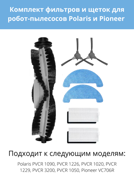 Комплект сменных аксессуаров для роботов-пылесосов Polaris и Pioneer. Подходит для следующих моделей: Polaris PVCR 1090, PVCR 1226, PVCR 1020, PVCR 1229, PVCR 3200, PVCR 1050, Pioneer VC706R. В комплекте: 1 основная щетка, 2 боковые щетки, 2 фильтра HEPA, 2 поролоновых фильтра, 2 тряпки. Основная щетка имеет V-образную форму ворса, ворсинки щетки выполнены из износостойкого нейлона, но достаточно мягкие, чтобы предотвратить повреждение напольного покрытия. Боковые щетки сделаны из ударопрочного пластика и износостойкого нейлона, отлично собирают пыль и мусор в углах, у стен. Фильтры HEPA задерживают мельчайшие частицы пыли и мусора, обеспечивая удаление аллергенов. Тряпки из микрофибры хорошо впитываю воду, чистят пол. Высокое качество исполнения.