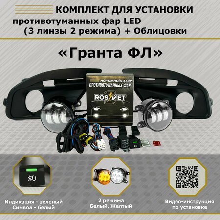 Комплект для установки противотуманных фар ПТФ для Лада Гранта ФЛ / Lada Granta FL. В комплект входит: Монтажный набор - 1шт; ПТФ фары - 2шт; Облицовка- 2шт (левая и правая); жгуты; кнопка; реле;