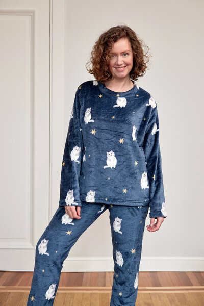 Теплый, домашний комплект бренда RS согреет вас зимой и прохладными летними вечерами. Плюшевый комплект состоит из свободного джемпера и полуприлегающих брюк. Данный комплект доступен в двух размерах и нескольких цветах. Дополните свой образ домашним халатом из нашей коллекции и ваш комплект будет готов к любому моменту отдыха. Этот теплый, мягкий комплект дарит комфорт и легкость при носке. Плюшевая текстура материала добавляет уюта, а свободный джемпер в сочетании с полуприлегающими брюками обеспечит вам свободу движений. Современный принт милого котика, по всей длине, лишь делает комплект более примечательным и заметным. Такой дизайн подчеркнет индивидуальность. Комплект домашний станет отличным подарком для ваших близких, особенно на 14 февраля, 8 марта или любой другой праздник. Он создаст атмосферу тепла и уюта в любое время года, а также станет незаменимым спутником для расслабляющих вечеров дома. Теплый, мягкий, плюшевый женский комплект со штанами — выбор, который дарит комфорт и стиль каждый день!