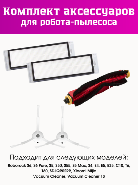 Комплект сменных аксессуаров для роботов-пылесосов Xiaomi, Roborock совместим с: Xiaomi Mi Robot Vacuum Cleaner, SDJQR01RR, SDJQR02RR, SKV4000CN, SKV4022GL, Vacuum Cleaner 1S, SDJQR03RR, SKV4054CN, CDZ03RR, Roborock S5 Max, S6/T6, S6 Max, S6 MaxV, S6 Pure, E4, E5, E4, E5, T60, T65, Roborock Sweep One S5, S50, S51, S55, 502-00, 552-00, Xiaowa E2, E3, E20, Lite, E35, E202, C102-00, C10. Комплект состоит из одной основной щетки, двух боковых щеток и двух фильтров HEPA. Основная щетка имеет V-образную форму ворса, благодаря которой собранная грязь перемещается в центр пылесоса, откуда мощный поток воздуха засасывает её в пылесборник. Ворсинки щетки выполнены из износостойкого нейлона, но достаточно мягкие, чтобы предотвратить повреждение напольного покрытия. Боковые щетки отлично собирают пыль и мусор в углах и у стен. Щетки сделаны из ударопрочного пластика и износостойкого нейлона. Не царапают пол, стены, мебель. Фильтры моющиеся, оснащены мелкой сеточкой и магнитом, имеют увеличенную площадь фильтрации, задерживают мельчайшие частицы пыли и мусора, обеспечивая удаление аллергенов. Фильтры изготовлены по технологии нера. Для устранения ошибок подбора сменных элементов, обратите внимание на размеры основных аксессуаров: Размер фильтра: 16,5 х 5,2 см Длина основной щетки: 19,5 см Длина руки боковой щетки: 6 см Аксессуары поставляются в индивидуальных упаковках. Помните, что сменные аксессуары подлежат замене каждые 2-3 месяца.