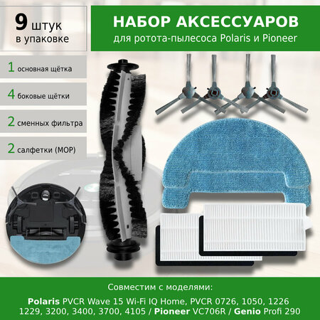 внимание: 1) Данный комплект является альтернативным, совместимый с брендом. 2) Боковые щётки могут быть погнуты при транспортировки. Положите щётку в горячую воду. Оставьте её на 5-10 минут в горячей воде. После выньте, щётка будет готова к использованию. 3) Чтобы ваш пылесос работал на максимальной производительности, фильтры должны меняться каждые 3 - 4 месяца. Товарный знак и логотипы Polaris, Pioneer и Genio являются зарегистрированными товарными знаками соответствующих владельцев. Любое использование торговой марки или названия модели Polaris, Pioneer и Genio для этого комплекта осуществляется исключительно с целью демонстрации совместимости.