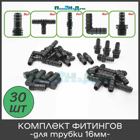 - Заглушка 16 мм - 8 шт; - Коннектор угловой 16 мм*16 мм - 8 шт; - Тройник 16 мм*16 мм*16 мм - 8 шт; - Соединитель трубки 16 мм*16мм - 2 шт; - Стартовая муфта 1/2" (наружная резьба) для трубки 16мм - 4 шт; В общей сложности 30 предметов.