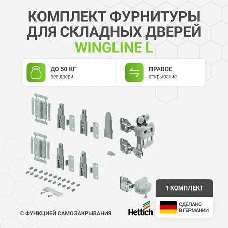 Комплект фурнитуры для складных дверей HETTICH Wing Line L Германия, 50 кг/дверь, правое открывание, 1 комп. Состав комплекта: Ходовой элемент, макс. 25 кг/на 1 створку (т.е. max 50 кг для двери из 2-х створок), с функцией самозакрывания (с пружиной) - 1 шт; Направляющий элемент с функцией самозакрывания (с пружиной) - 1 шт; Петли для складных дверей - 4 шт; Разметочный шаблон средней петли - 2 шт; Демпфер для дверей - 2 шт; Элемент для фиксации в открытом положении - 1 шт; Накладка для ходового элемента - 1 шт; Крепежные винты