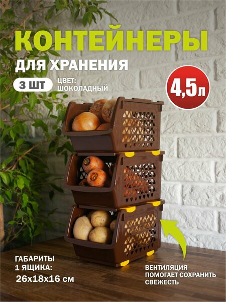 Комплект ящиков для овощей "Интерм" - это удобный и практичный способ хранения продуктов на вашей кухне. Ящики изготовлены из высококачественных материалов и имеют объем 4.5 литра каждый, что позволяет хранить большое количество овощей и фруктов. Ящики имеют множество мелких отверстий, которые обеспечивают циркуляцию воздуха внутри, что помогает сохранить свежесть продуктов и предотвратить их гниение. Они также легко моются и не занимают много места на кухне. В комплект входят 3 ящика, что позволяет выбрать оптимальный размер для вашего пространства. Вы можете использовать их для хранения лука, чеснока, картофеля, свеклы, моркови, яблок и других овощей и фруктов. Кроме того, они также могут быть использованы для хранения других предметов, таких как игрушки, пряжа или полотенца. Компактное хранение в холодильниках, шкафах под мойкой или на полках шкафов делает эти ящики идеальным выбором для тех, кто ценит порядок и удобство на кухне.