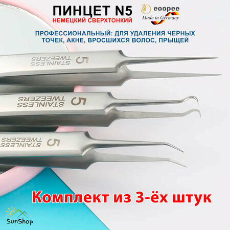 Профессиональный набор из 3-ёх немецких сверхтонких пинцетов для удаления черных точек, акне, вросшихся волос, прыщей. В набор входит: ультратонкий прямой пинцет, пинцет с изогнутыми под 45° кончиками, пинцет с локтевым изгибом в 125°. Материал: Нержавеющая сталь Длина: 117мм, Ширина: 10мм, наконечник на острие - 0.5мм. Продвинутые немецкие технологии позволяют пинцету добиться окклюзии высокой точности. Пинцет имеет чрезвычайно тонкие наконечники и может удалить даже сверхтонкие волосы, а эргономичная изогнутость позволяет комфортно и удобно его держать, не уставая. Пинцет сделан из упругой негнущейся немецкой стали. Ручная заточка каждого кончика пинцета позволяет достичь супер остроты пинцета, а также точного захвата, что позволяет таким пинцетов выдергивать даже очень тоненькие вросшиеся в кожу волоски. Изогнутый пинцет антиаллергенен, термоустойчив и сделан из антиоксидантного материала. Косметический набор инструментов от прыщей и от черных точек на носу/ пинцет медицинский от акне/ косметический набор женский для чистки лица. Комедоны, акне, вросшие волосы, прыщи, черные точки, угри, - все это является нормальным проявлением для жирной кожи лица. Наш набор из ультратонких пинцетов поможет справится с подобными проявлениями. Половина населения нашей планеты страдает от всех этих неприятных кожных проявлений. По статистике каждый второй человек находится в поисках идеального средства для лица против акне, против вросших волос, от прыщей и черных точек. Этот набор для удаления черных точек, для удаления угрей и от акне на лице, станет для вас самым любимым и незаменимым средством для жирной кожи лица. Инструменты для чистки лица. Лечение акне никогда не было настолько бюджетным и эффективным одновременно. Теперь для избавления от жирной кожи лица вам не придется тратить большие деньги на дорогие услуги косметологов, у вас будет свой собственный акне киллер: наш набор профессиональных ультратонких пинцетов.