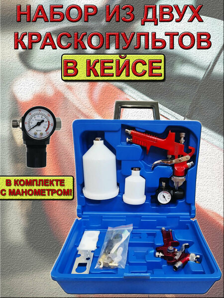 Краскопульт- 2шт Манометр - 1шт Ключ для разборки - 2 шт.Кейс для хранения -1 шт.Бачок 0.6л - 1шт Бачок - 0.1л - 1шт