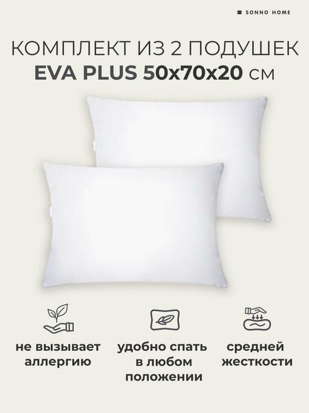 {"widgets":{"@card/UniversalPromoBadge":{"/content/page/fancyPage/universalPromoBadge":{"wrapperProps":{"margins":{"bottom":"3"}},"initialTime":1760280279129,"offerComposeId":"55786249"}}},"meta":{"/content/page/fancyPage/universalPromoBadge":{"name":"@card/UniversalPromoBadge"}},"collections":{"productServiceSnippets":{"55786249":{"productSnippet":{"type":"MODEL_CARD_LAYOUT","productPayload":{"snippetStyle":"NORMAL","title":{"value":"Sonno Home Комплект из двух подушек для сна EVA PLUS 50x70х20 см , средней жесткости, гипоаллергенный наполнитель Amicor TM"},"badges":{},"gallery":{"mediaItems":[{"picture":{"baseUrl":"https://avatars.mds.yandex.net/get-mpic/11240005/2a000001966cca8d311fc724f7aa04d9189f/","width":1000,"height":1333,"title":"Sonno Home Комплект из двух подушек для сна EVA PLUS 50x70х20 см , средней жесткости, гипоаллергенный наполнитель Amicor TM"},"type":"IMAGE"},{"picture":{"baseUrl":"https://avatars.mds.yandex.net/get-mpic/3909438/2a000001966cca8d33af913d7406e63266d9/","width":1000,"height":1333,"title":"Sonno Home Комплект из двух подушек для сна EVA PLUS 50x70х20 см , средней жесткости, гипоаллергенный наполнитель Amicor TM"},"type":"IMAGE"},{"picture":{"baseUrl":"https://avatars.mds.yandex.net/get-mpic/13230222/2a000001966cca8d31284fe64e467df0afe8/","width":1000,"height":1333,"title":"Sonno Home Комплект из двух подушек для сна EVA PLUS 50x70х20 см , средней жесткости, гипоаллергенный наполнитель Amicor TM"},"type":"IMAGE"},{"picture":{"baseUrl":"https://avatars.mds.yandex.net/get-mpic/4762868/2a00000196286c10fd6e03318f42f0bb7715/","width":1000,"height":1333,"title":"Sonno Home Комплект из двух подушек для сна EVA PLUS 50x70х20 см , средней жесткости, гипоаллергенный наполнитель Amicor TM"},"type":"IMAGE"},{"picture":{"baseUrl":"https://avatars.mds.yandex.net/get-mpic/14873814/2a00000196286c0fe3bc35ec7a07aef103e8/","width":1000,"height":1333,"title":"Sonno Home Комплект из двух подушек для сна EVA PLUS 50x70х20 см , средней жесткости, гипоаллергенный наполнитель Amicor TM"},"type":"IMAGE"},{"picture":{"baseUrl":"https://avatars.mds.yandex.net/get-mpic/12641020/2a00000196286be7f916685c3233fec15b2f/","width":1000,"height":1333,"title":"Sonno Home Комплект из двух подушек для сна EVA PLUS 50x70х20 см , средней жесткости, гипоаллергенный наполнитель Amicor TM"},"type":"IMAGE"},{"picture":{"baseUrl":"https://avatars.mds.yandex.net/get-mpic/11483501/2a00000196286bf239f7a50bfe77724a4fc2/","width":1000,"height":1333,"title":"Sonno Home Комплект из двух подушек для сна EVA PLUS 50x70х20 см , средней жесткости, гипоаллергенный наполнитель Amicor TM"},"type":"IMAGE"},{"picture":{"baseUrl":"https://avatars.mds.yandex.net/get-mpic/12216141/2a00000196286c13fccd9936f6ae96f1671b/","width":1000,"height":1333,"title":"Sonno Home Комплект из двух подушек для сна EVA PLUS 50x70х20 см , средней жесткости, гипоаллергенный наполнитель Amicor TM"},"type":"IMAGE"},{"video":{"url":"https://frontend.vh.yandex.ru/player/v0gfo3Dp0N2s","width":1920,"height":1080,"title":"Sonno Home Комплект из двух подушек для сна EVA PLUS 50x70х20 см , средней жесткости, гипоаллергенный наполнитель Amicor TM","preview":{"baseUrl":"https://avatars.mds.yandex.net/get-mpic/15992133/2a000001966cd9c64967b0d1e071166bb488/","width":1920,"height":1080,"title":"Sonno Home Комплект из двух подушек для сна EVA PLUS 50x70х20 см , средней жесткости, гипоаллергенный наполнитель Amicor TM"},"streams":[{"type":"dash","url":"https://strm.yandex.ru/vod/vh-market-upload-converted/vod-content/9128013060245994243/e591f3cf-2865-47e8-b195-5b161efbb2a4/kaltura/desc_54b3ede64822817b7912401572e1eea7/7725771481940494290/ysign1=b81e5f07574389135b2a085b00e3dff0e6502db97d607d3fccc1d06ab8589066,abcID=1632,from=unknown,pfx,sfx,ts=68f8edd7/manifest.mpd"},{"type":"hls","url":"https://strm.yandex.ru/vod/vh-market-upload-converted/vod-content/9128013060245994243/e591f3cf-2865-47e8-b195-5b161efbb2a4/kaltura/desc_54b3ede64822817b7912401572e1eea7/7725771481940494290/ysign1=1c0baff888b0594eb84326a481e46503d51dc9d8ec79f8ae6ea33f79893f35f8,abcID=1632,from=unknown,pfx,sfx,ts=68f8edd7/master.m3u8"}]},"type":"VIDEO"}],"galleryType":"VISUAL"},"rating":{"ratingValue":4.7,"ratingCount":55,"reviewsCount":18,"ratingCountStats":{"cnt1":1,"cnt2":0,"cnt3":3,"cnt4":5,"cnt5":46}},"wishlistButton":{"businessId":918727,"mskuId":102709231869,"modelId":55786249,"oskuId":102709231869}},"baobabPayload":{"type":"offer","wareId":"out-of-stock","modelId":55786249,"marketSku":"102709231869","snippet_type":"product","isExpress":false,"vendorId":60522211,"hid":63241933,"isUltima":false,"oskuId":102709231869}}}}}}