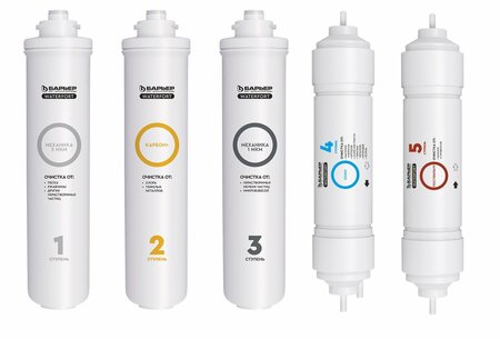В комплект входит: 1. "БАРЬЕР WaterFort Механика" удаляет любые механические примеси до 5 мкм (песок, ржавчину и другие механические примеси). 2. "БАРЬЕР WaterFort Карбон+" - Удаления хлора и хлорорганических соединений, тяжелых токсичных металлов. 3. "БАРЬЕР WaterFort Механика 1 мкм" - финишная механическая очистка от мелкодисперсных взвесей размером более 1 мкм. 4. «БАРЬЕР WaterFort Осмо» - мембрана обратного осмоса. Конструкция пропускает молекулы воды. Поры мембраны в 200 раз меньше размеров вирусов и в 4000 раз – бактерий. Все вредные примеси смываются в дренаж. Производительность 100 галлонов. 5. «БАРЬЕР WaterFort Постфильтр» - кондиционирование воды. Дополнительная очистка после накопительной емкости. Устраняет неприятные запахи и привкусы.