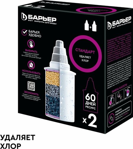 Базовая очистка водопроводной воды от хлора, тяжелых металлов и других вредных примесей. Удаляет посторонние привкусы и запахи. Резьбовое соединение надежно фиксирует кассету и не дает попасть нефильтрованной воде в чистую. Ресурс зависит от качества исходной воды, но составляет не более 350 литров. В состав кассеты входит: •смесь ионообменных смол - удаляет ионы тяжелых металлов; •кокосовый активированный уголь, обработанный серебром, - предотвращает рост бактерий; •кокосовый активированный уголь - удаляет хлор и хлорорганику; •ионообменное волокно - удаляет тяжелые металлы и растворенное железо. Технология NanoPlus увеличивает эффективность и ресурс компонентов кассеты. Тем не менее, сорбционная емкость кассеты ограничена, поэтому рекомендуется менять её не реже, чем раз в 2 месяца. В упаковке находится 2 кассеты БАРЬЕР Стандарт, все кассеты БАРЬЕР подходят ко всем кувшинам БАРЬЕР. Одна кассета БАРЬЕР способна заменить несколько сотен пластиковых бутылок. По окончании ресурса кассеты можно сдать на переработку.