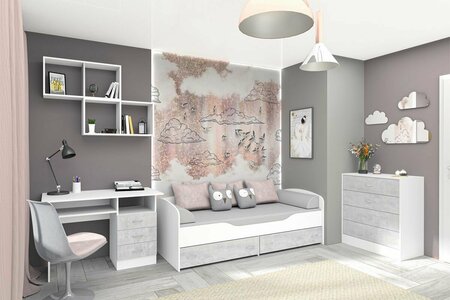ММК "Бриз" способна хорошо вписаться в дизайн практически любой детской комнаты. За счёт своей многофункциональности она долгое время будет оставаться для ребёнка удобной и комфортной. В комплект входят: - Две полки навесных 740 (740х377х220 мм); - Письменный стол с тремя вместительными ящиками и открытыми нишами под столешницей (1100х750х600 мм); - Кровать № 2.1 с двумя удобными ящиками для хранения (1942х700х862 мм, спальное место 800х1900); - Комод (800х891х430 мм). * Матрас в комплектацию не входит, приобретается отдельно. Характеристики