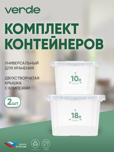 Набор вместительных, прозрачных контейнеров состоит их 2 штук - 10л и 18л. Пластиковые контейнеры с крышкой изготовлены из экологически чистого полипропилена (PP) и подойдут для хранения пищевых продуктов (например овощей) и различных предметов (игрушки, одежда, обувь и т. д.). Крышка надежно фиксируется на емкости, защищая содержимое от пыли, влаги. Пластиковый контейнер для хранения с крышкой и защелками одна из самых популярных линеек от компании VERDE. Стильная и практичная серия больших и маленьких многофункциональных ящиков (корзин), призванная поддержать идеальный порядок и грамотно организовать пространство для хранения, можно хранить в шкафу. Из нашей серии можно собрать набор контейнеров (коробок, корзинок). Данная коллекция находит применение не только в доме, но и в гараже, мастерской, в помещении хозяйственного назначения, автомобиле и т. д. Прозрачный пластмассовый бокс подойдет для хранения различных вещей, детских игрушек, одежды.