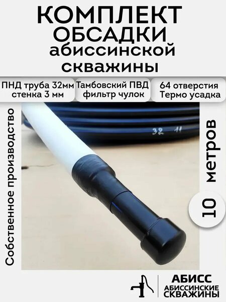 Комплект обсадки для абиссинской скважины выполненной гидробурением - фильтр ПВД (чулок) смонтирован на перфорированную трубу ПНД 32мм - это быстрый, удобный, и демократичный способ обсадки пробуренной скважины методом гидробурения. На трубе ПНД ПЭ100, SDR11 питьевая ГОСТ18599-2001 с толщиной стенки 3мм. выполнено 64 отверстия диаметром 10мм, что дает возможность воде из скважины с избытком поступать в колонну при этом не снижая жесткость трубы в фильтре. Ширина перфорации 900мм. На перфорированную часть установлен тот самый Тамбовский фильтр чулок выполненный из полиэтилена высокого давления (ПВД) ГОСТ 16377-77 - на сегодняшний момент являющийся одним из самых удобных и эффективных фильтров для абиссинских скважин. Фильтр надежно крепится к трубе несколькими способами, включая термоусадочный рукав, что максимально снижает возможность его отрыва и деформации при монтаже. Длина фильтра 1м. С нижней стороны труба заглушена при высоких температурах. Конструкция не имеет стыков и соединений. При выборе комплекта, пожалуйста, учитывайте предполагаемую глубину вашей скважины и заказывайте комплект, примерно +5 метров к глубине самой скважины. Это даст вам возможность спокойно подключить насосное оборудование. Увеличение длины трубы в процессе работ может быть очень проблематичным. Комплект поставляется в бухте.