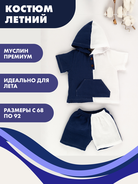Комплект выполнен из хлопчатобумажной ткани муслин (2-х слойный). Это нежная мягкая ткань, не дает усадки при стирке, не выцветает. Ткань премиум класса. Комплект состоит из кофточки на пуговицах (кнопках) с капюшоном и шорт. Ваш малыш будет выглядеть стильно и красиво на прогулке каждый день. Костюм для новорожденных из муслина - это прекрасный вариант для прогулок, он особенно комфортен в летнюю жаркую погоду. Летний комплект имеет свободный крой, который не будет сковывать движений даже с учетом подгузника. Комплект состоит из футболки и шорт, выполненных из сочетания тканей двух цветов - яркого и белого цвета. Такое сочетание делает его воздушным, нарядным и очень красивым. Нарядный комплект для мальчиков и девочек на лето может стать отличной идеей для подарка! При правильном уходе ткань не полиняет, а костюм останется в первоначальном виде весь период носки. Стирать рекомендуем в воде до 30 градусов руками или в деликатном режиме, лучше без отжима или на низких оборотах. Материал: муслин, хлопок 100%