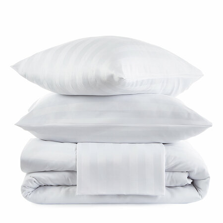 Комплект постельного белья изготовлен из страйп-сатина. Страйп-сатин имеет жаккардовую текстуру, а именно - чередование полос, часть из которых переливается как шелк, а часть остается матовой. Благодаря своем плетению, данная ткань имеет высокую прочность и износостойкость, при этом мягкая и приятная к телу. А также не сильно мнётся и довольно проста в уходе. Пододеяльник на молнии, для более удобного использования. Постельное белье из страйп-сатина часто используется в отелях премиум-сегмента, а также в частных медицинских учреждениях. Такое белье прослужит долгие годы и выдержит множество стирок и химических обработок. Комплект состоит из пододеяльника размером 200х220 см; простыни 220х240 см; наволочек 50х70 см - 2 шт, 70х70 см - 2 шт. Плотность ткани: 120 г/м3