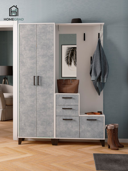 Благодаря модульности прихожей «Vitra» покупатель может собрать свой комплект из отдельных элементов. Наличие шкафа в новинке «Vitra» позволяет решить проблему с размещением сезонной одежды и обуви. Секция комбинированная станет отличным дополнением для шкафа или самостоятельным компактным решением для маленькой прихожей. На этой вешалке можно свободно разместить верхнюю одежду, а наличие ящиков позволит разложить головные уборы и аксессуары. Элегантность и функциональность прихожей «Vitra» в союзе с современным дизайном создадут приятную, удобную и приветливую атмосферу в вашем доме. Внутренние фасады, сборка центральной секции не универсальная. Щит центральной секции (вешалка) прикрепляется к стене на навесы. Для соединения с тумбой необходимо приобрести дополнительные евровинты (конфирмант).