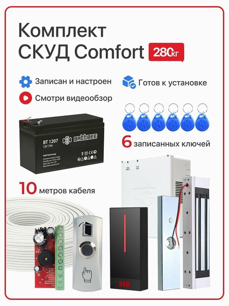 Готовый комплект системы контроля доступа СКУД "COMFORT" с аккумулятором и электромагнитным замком на 280 кг Универсальное решение для организации безопасного прохода через входную дверь, калитку или ворота. Подходит для установки в частных домах, офисах, на складах, в подъездах и служебных помещениях. Что входит в комплект:
