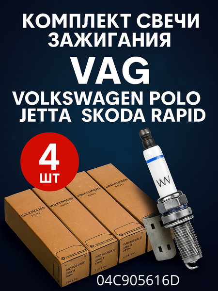 Свеча зажигания VAG 04C905616D — это иридиево-платиновая свеча с центральным электродом из иридиевого сплава и заземляющим электродом из платины. Предназначена для использования в автомобилях Volkswagen Grouр. Некоторые характеристики: зазор между электродами: 0,8 мм; размер резьбы: М14х1,25; длина резьбы: 19 мм; количество боковых электродов: 1; калильное число: 6; тепловой диапазон: холодная свеча зажигания, подходящая для использования при высоких температурах и нагрузках. Свечи зажигания 04C905616D применимы для следующих автомобилей: Volkswagen: Caddy универсал IV (SAB, SAJ), Caddy фургон IV (SAA, SAH), Golf Sportsvan минивэн VII (AM1, AN1), Golf Variant VII (BA5, BX5, BV5, BX6), Golf хэтчбек VII (5G1, AU1, AU2, BQ1, BE1, BE2), Jetta седан VI (162, 163, AV2, AV3), Load Up фургон (121, 122, BL1, BL2), Polo седан V (612, 614), Polo хэтчбек V (601, 602, 603, 604, 6R1, 6С1), Polo хэтчбек VI (AW1), Up хэтчбек (121, 122). Skoda: Citigo (NF1), Fabia универсал III (NJ5), Fabia хэтчбек III (NJ3), Octavia лифтбек III (5E3, NL3), Octavia универсал III (5E5), Rapid Sportback универсал (NH1), Rapid лифтбек (NH3, NK3), Yeti (5L6, 5L7, 676, 677). SEAT: Ibiza Sportcoupe купе IV (6J1, 6P1), Ibiza ST универсал IV (6J8, 6P8), Ibiza хетчбек V (KJ1), Ibiza хэтчбек IV (6J5, 6P5), Mii (KF1). Свечи с артикулом VAG 04C905616D подходят для двигателей CWVA и CWVB.