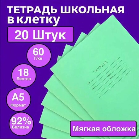 Комплект тетрадей из 20 штук, 18 листов в клетку КПК "Зелёная обложка" является идеальным выбором для школьников, студентов и офисных работников. Эти тетради помогут организовать учебный процесс или рабочие записи, обеспечивая высокое качество бумаги и стильный внешний вид.